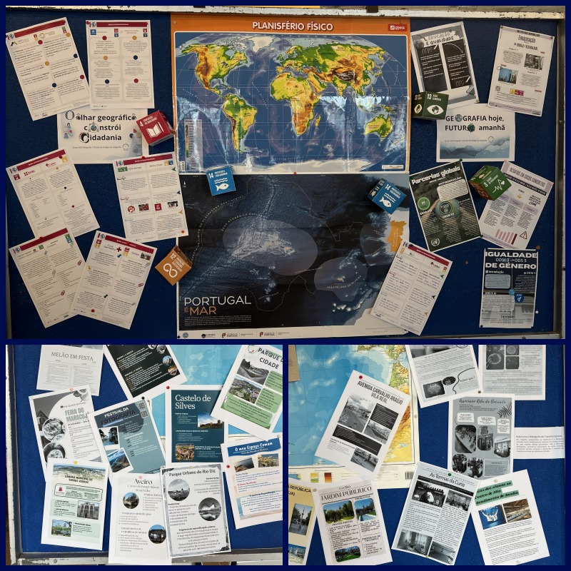 Foram organizadas exposições com trabalhos desenvolvidos pelos alunos do 9.º, 10.º, 11.º e 12.º anos. Os projetos apresentados refletiram as temáticas exploradas nas aulas — desde as dinâmicas populacionais às questões ambientais, das alterações climáticas à organização do território — evidenciando as aprendizagens essenciais da disciplina e a forma como a Geografia ajuda a compreender o mundo que nos rodeia. Pequenos quizzes, enigmas e questões sobre atualidade geográfica despertaram a curiosidade e promoveram momentos de saudável competição e aprendizagem partilhada.