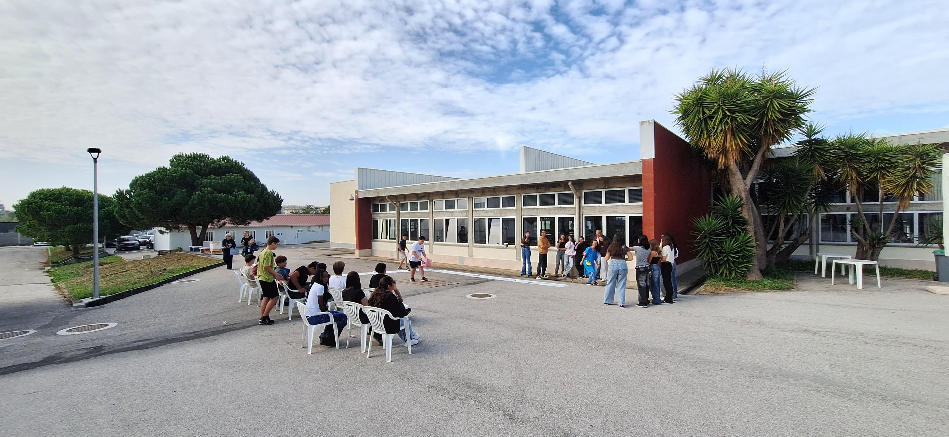 No pátio exterior da escola decorreu uma atividade para os alunos do 9.º ano que consistiu num jogo de tabuleiro, em formato XL, sobre alimentação.