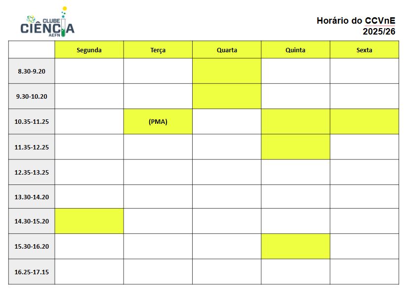 Nas horas indicadas, poderás dirigir-te à sala do Clube CV (sala anexa à 26B, na escola CT) para dinamizar algumas atividades no âmbito das Ciências Experimentais ou preparar atividades planificadas pelo Clube.