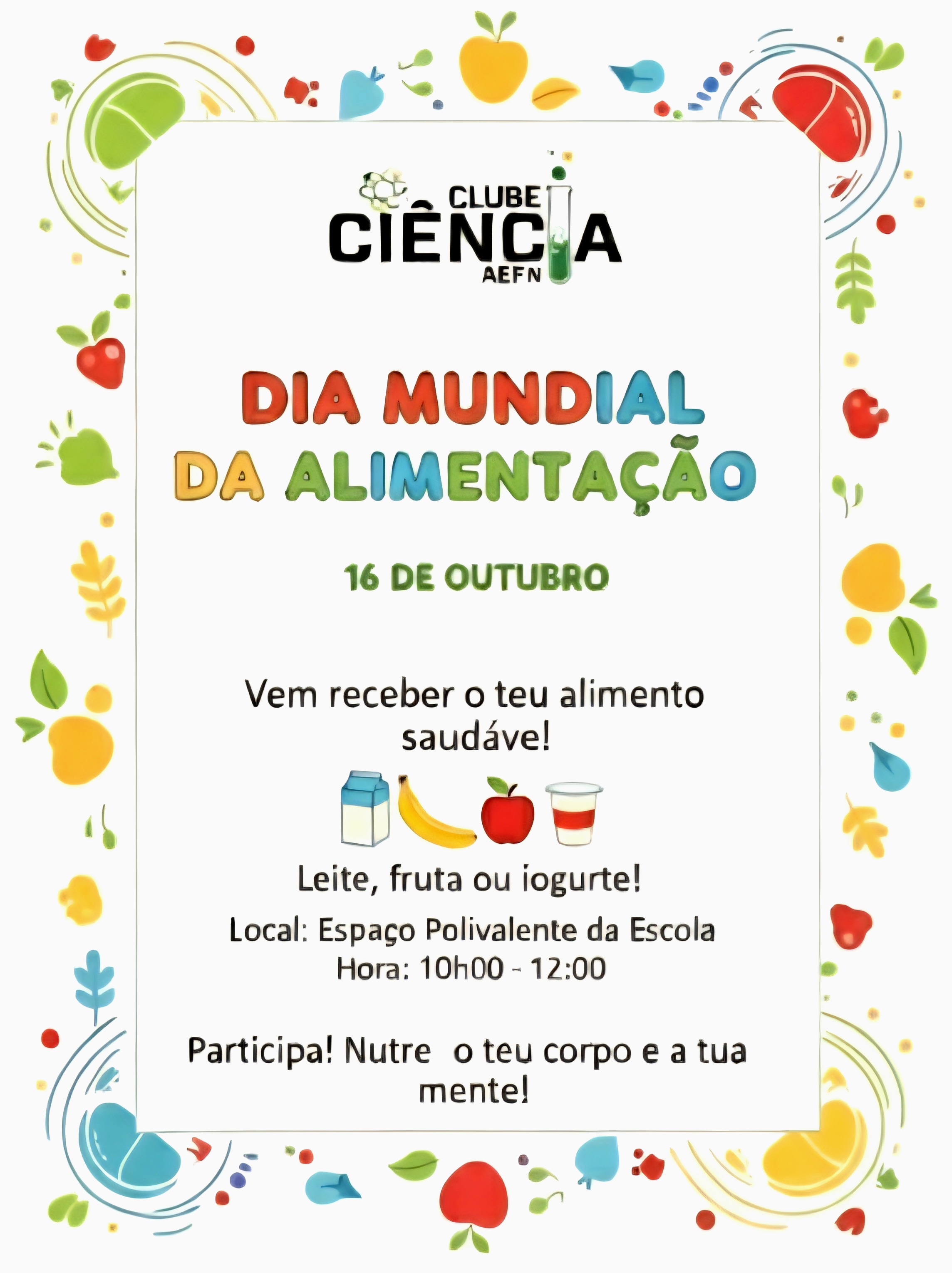 Para celebrarmos este dia e promovermos hábitos saudáveis, o Clube Ciência Viva irá simbolicamente oferecer alguns alimentos – leite, fruta, iogurte ou gelatinas – a quem passar pelo Polivalente da Escola, durante os intervalos da manhã.