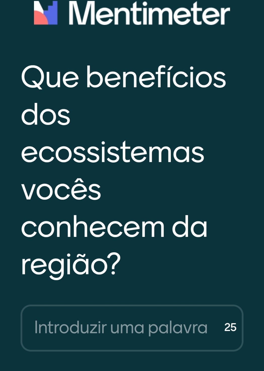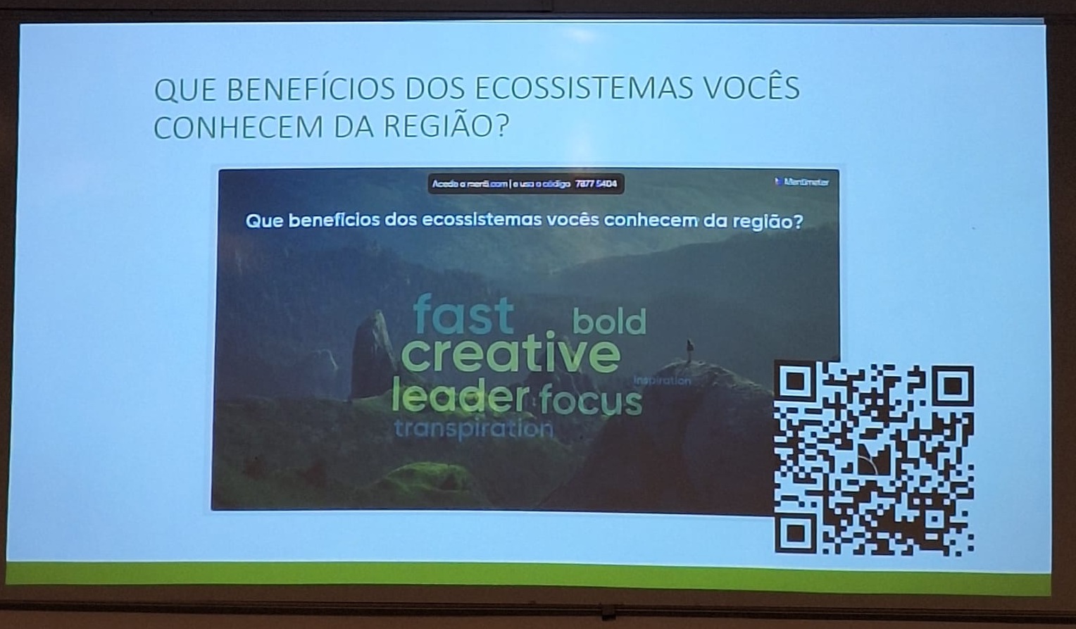 Esta atividade foi dinamizada pela Dr.ª Paula Castro e pela Dr.ª Luciana Frazão, investigadoras do Centro de Ecologia Funcional da Universidade de Coimbra, a quem muito agradecemos a disponibilidade e simpatia. Durante a sessão, as investigadoras exploraram conceitos como serviços de regulação, culturais e de suporte, mostrando como a natureza contribui diariamente para o bem-estar humano, muitas vezes de forma invisível.