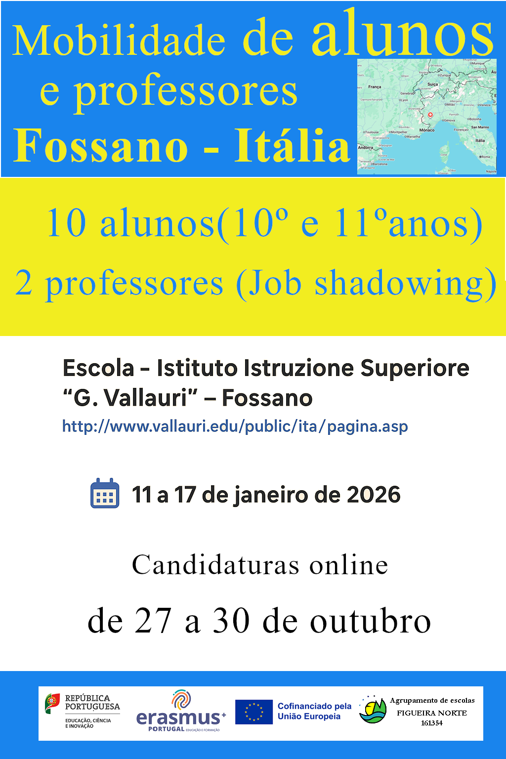 De 11 a 17 de janeiro de 2026, a nossa escola é parceira da Escola - Istituo Istrutzione Superiore “G. Vallauri” – Fossano, Itália, que podes conhecer neste link http://www.vallauri.edu/public/ita/pagina.asp